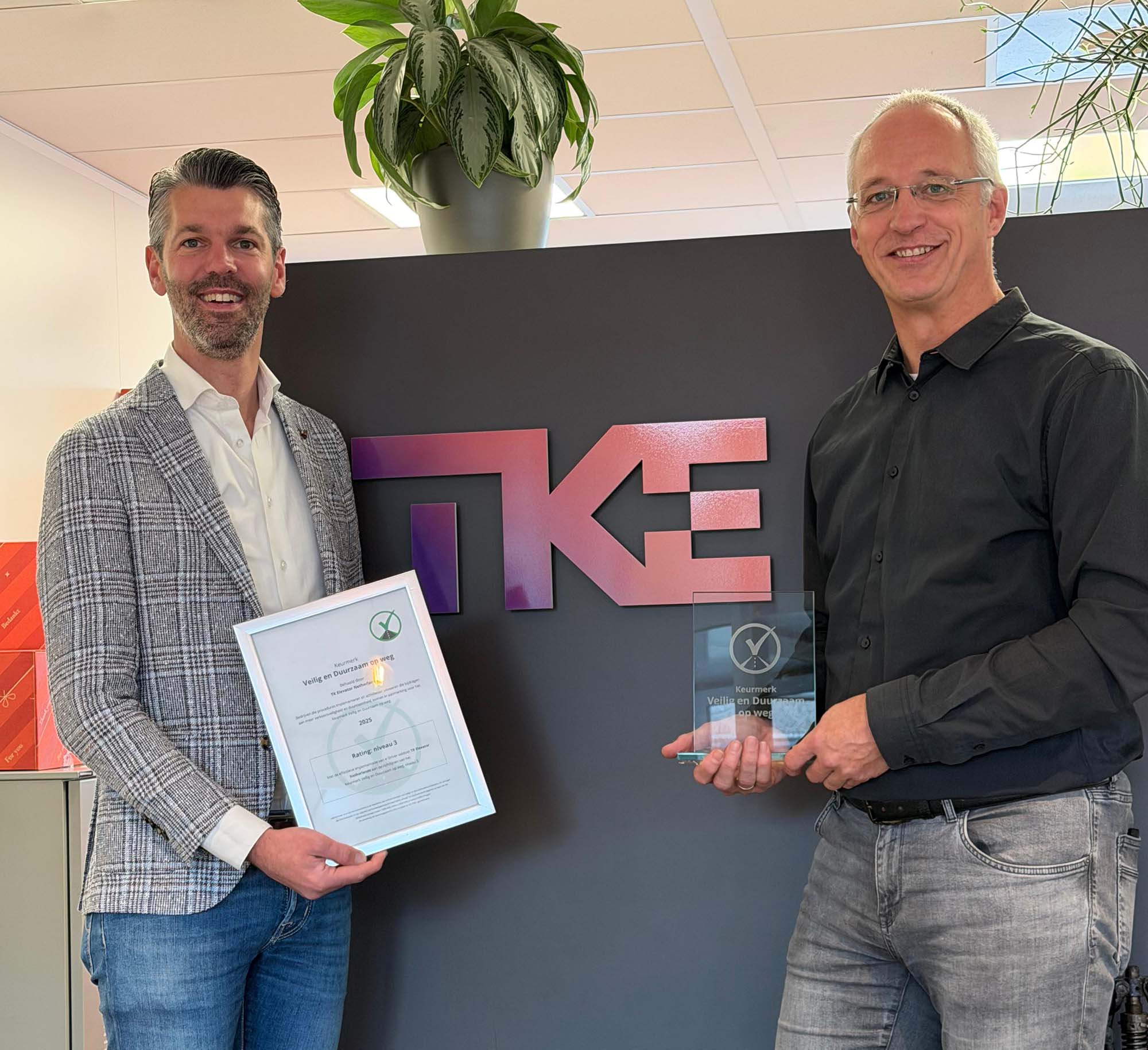 Het Keurmerk Veilig en Duurzaam op Weg niveau 3 werd uitgereikt aan Robin van der Voort van TK Elevator door Collin Bell van de Verkeersveiligheid Groep Nederland. De erkenning onderstreept de inzet van het bedrijf om veiligheid niet alleen in gebouwen, maar ook onderweg structureel te verbeteren.
